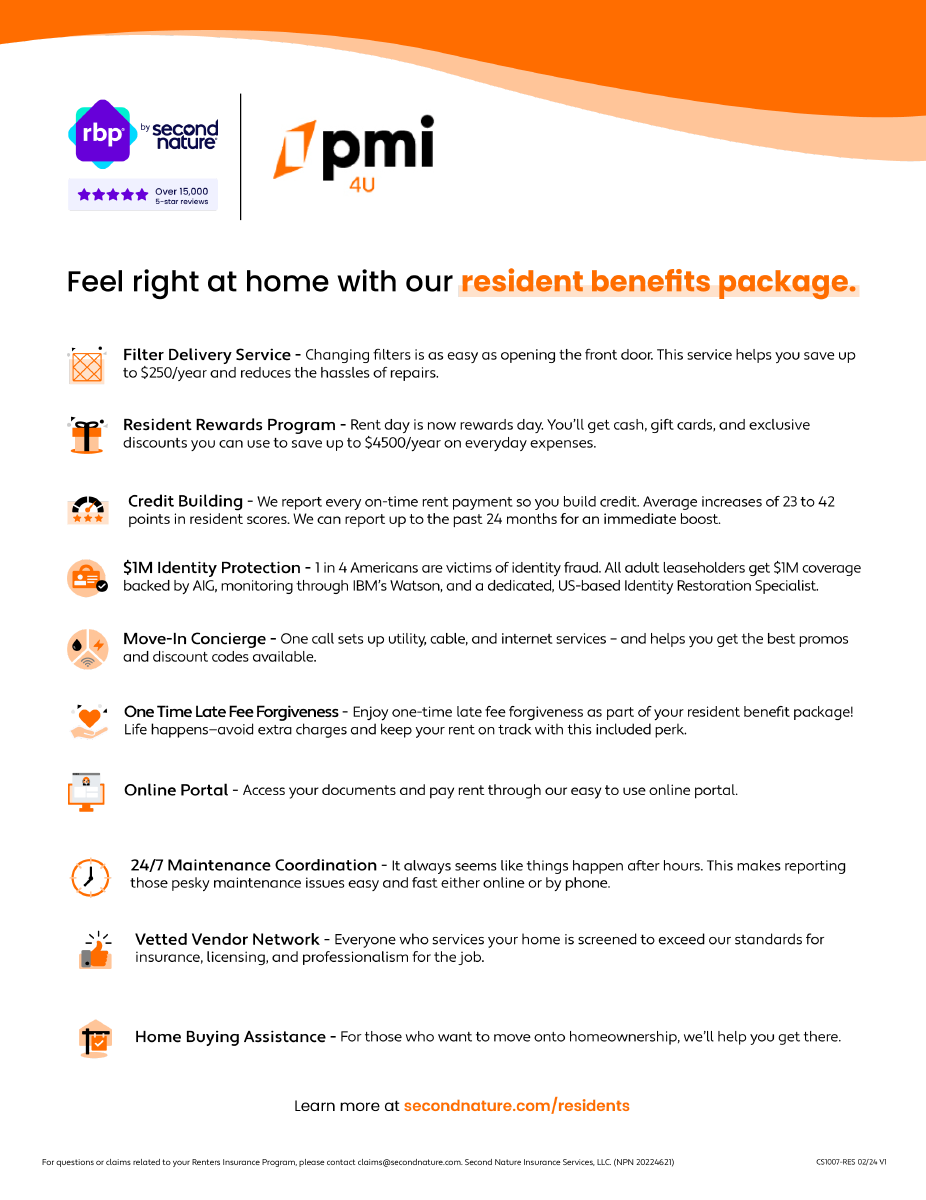 PMI 4U residents! We've got some great perks for you as part of our Resident Benefits Package (RBP) for just $29.99/month. This includes credit building to boost your credit score, $1M Identity Protection, and a utility concierge service, among other benefits. Enjoy!